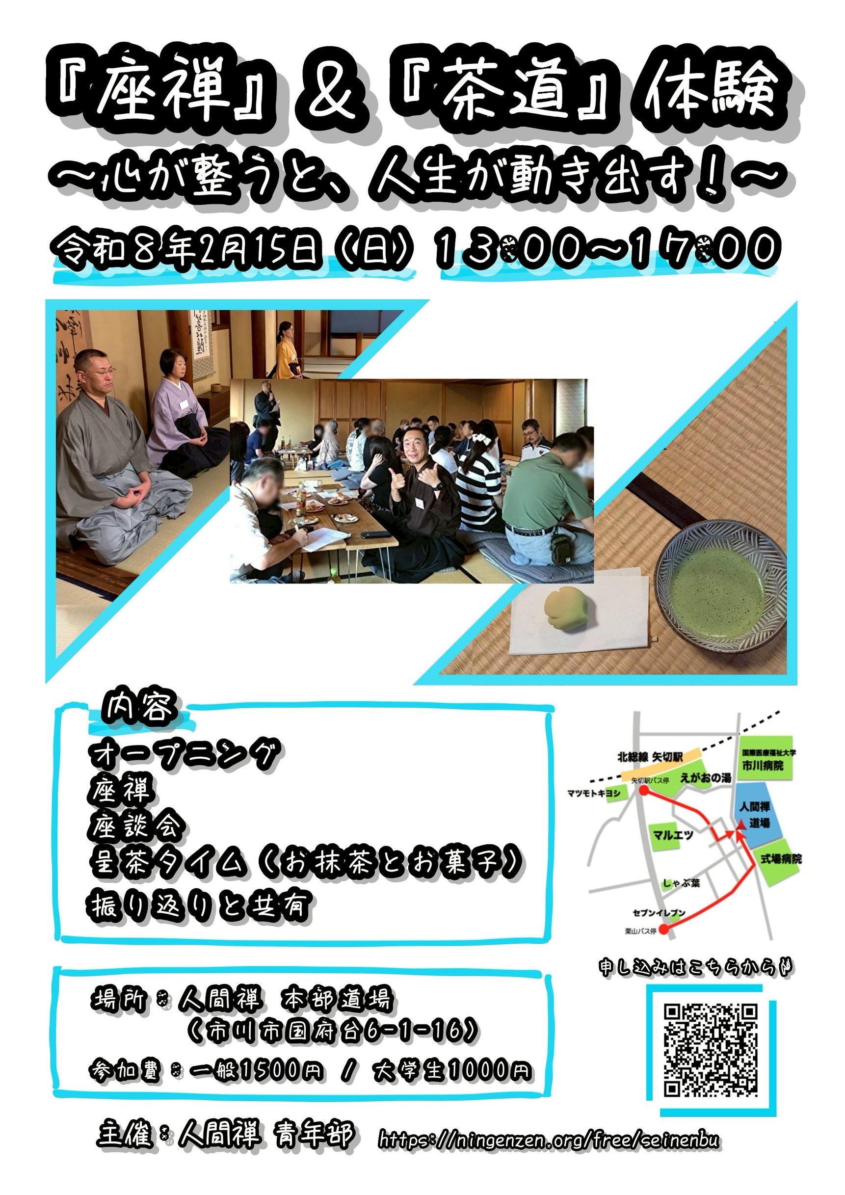 | 参加費 | 通常価格 4,500円(税込) 🔽2026年 特別記念価格 一般社会人 1,500円(税込) 大学生 1,000円(税込) 🍀お抹茶とお茶菓子& 🍀座禅の説明資料パンフ付 |